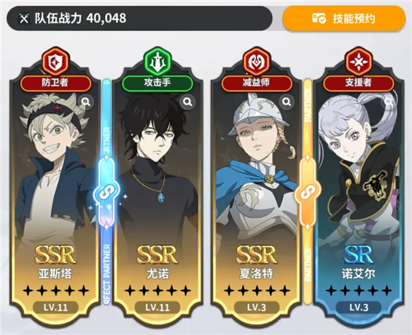 在推进到第1章第3节时,我们会获得【亚斯塔+尤诺+夏洛特】的SSR魔导士组合。根据实际情况再配置任意一位魔导士的话,可靠的「前期阵容」就诞生啦!建议重点养成尤诺,他优秀的战斗能力在冒险中能为你披荆斩棘。