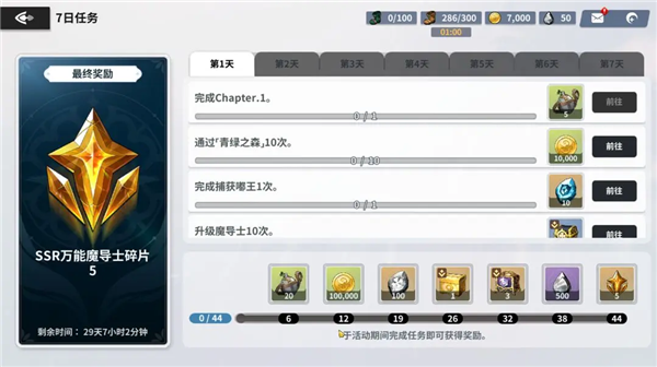 在「7日任务」里面给你们安排了超级丰厚的奖励,有黑水晶以及抽卡资源!达成最终目标,还可以获得5个「SSR万能碎片」!