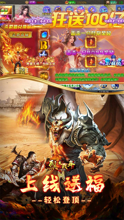 《烈火战车》是一款经典单职业传奇手游,登录就送六大 BUFF 福利,包括自动回收、全屏拾取等功能,诚意满满。游戏融入专属沉默剧情和高爆福利,上线就能免费领取高级会员和各种资源,非常适合喜欢怀旧的玩家。游戏中还有特色兽魂系统,激活后能召唤护体,轻松击杀 BOSS,更有隐藏剧情和彩蛋等你发现。
