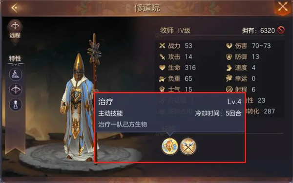 前期圣堂会送一个加盾的紫色英雄克里斯蒂安,主动技能可以给队友加一个强力的盾。你经常带他出去就会发现这个盾是优先加给前排的步兵。有了强力的护盾加上步兵高额的免伤可以最大化的减少自己前排的损失。(在打架之中绝大多数的输出都是优先攻击前排步兵,在是机动和远程。步兵的存活可以极大的减少后排的损失。)作为出战的主将推荐优先把防御和步兵的被动技能点出来。有条件的情况下把防御点满。