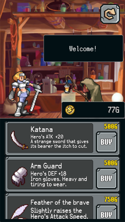 1、手动攻击:只有勇者按下攻击键后会立刻攻击,尝试点击攻击键,进行战斗吧