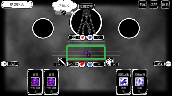 4、玩家生命条耗尽即宣告失败,这里显示玩家的基本属性,分别是[血量/护盾]→承受伤害,[护盾]→回合结束时清空,[力量]→强化卡牌的攻击能力,[耐力] 增加卡牌提供的护甲。