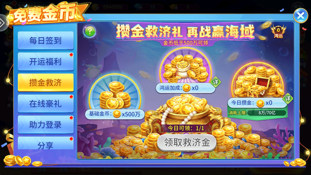 3、当你金币低于500万时可以领取救济礼。