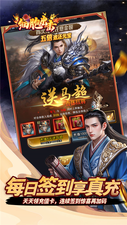 PS:细胞出击(0.05折三国送满V)内置0.05折充值福利,全游任意充值统统0.05折,1元可抵200元,开局即送顶级自选金将、百抽招募令,升级还送万充,累登八天即可领稀有红将!