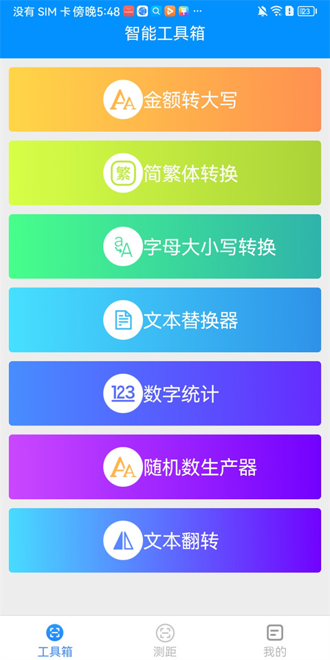 高能测量仪手机版是一款集手机工具箱和测量功能于一体综合性应用,它提供金额转大写、简繁体转换、字母大小写转换、文本替换器、数字统计、随机数生成、文本翻转以及测高测距等多种工具,可帮助用户轻松处理日常任务。高能测量仪App还支持持一键简繁体互转、字母替换和文本修改,且能快速生成随机数,让用户无需携带重型仪器即可获得准确数据!