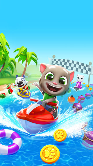 游戏中有五名免费角色(汤姆猫、安吉拉等)和25款不同的摩托艇,玩家还可以用赚到的钱建造自己的海滨度假村。特色包括在五个不同世界比赛,赢得宝箱解锁奖励,以及无尽模式的玩法。每个阶段都有三个任务,比如冲击鸭子、斜坡和侧撞浮标。