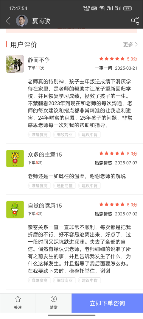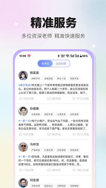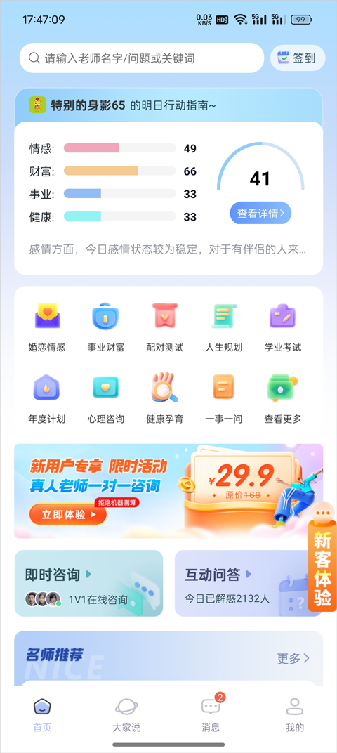 App的使用流程也很简单,进入首页后可以根据分类板块(比如婚恋情感、事业财富等)找到自己需要的内容,或者直接选择【即时咨询】快速解决问题。此外,还能查看其他用户的评论和评价,帮助更好地了解老师和问题。