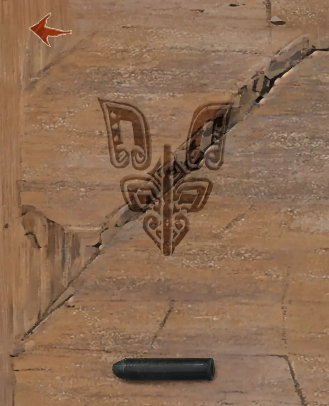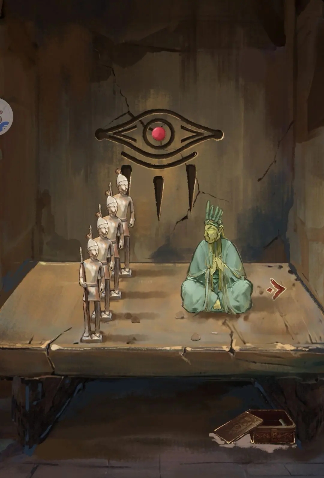 将两个神人面具放在最左边场景右上角的方形空隙中,依次点击两个面具,前面的大石头上出现两个图案。