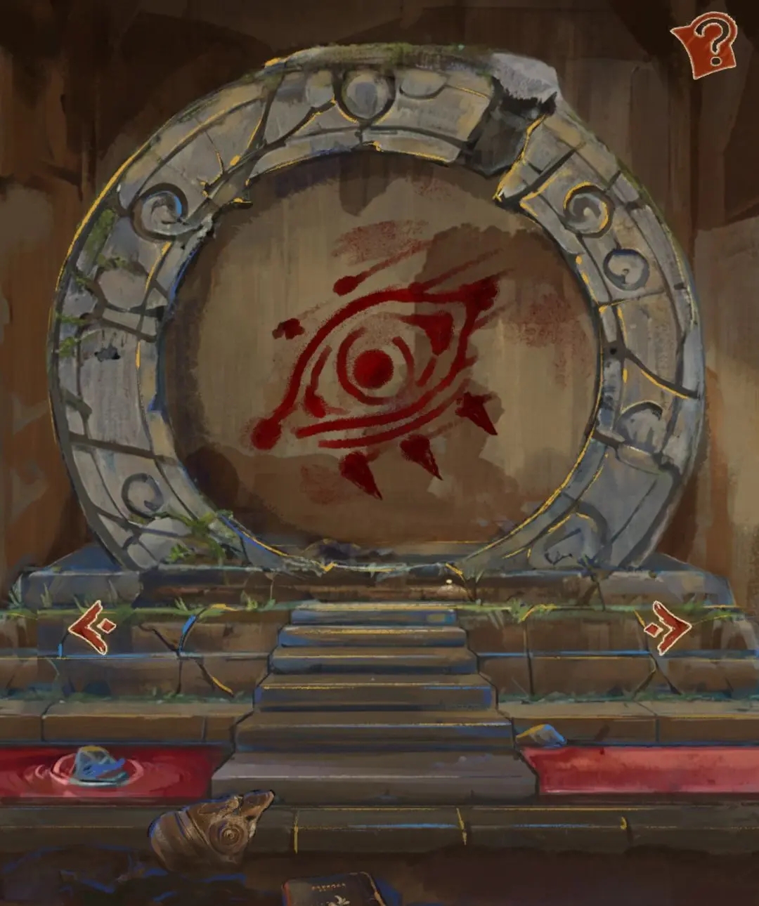 点祭坛场景下方箭头,石块掉落把之前的门堵死。点地上的书翻页左下角看后面内容。