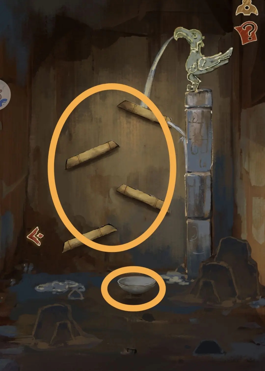 找到水流场景,将竹筒方向调整如下,使下方玉瓷碗中盛满水拿走(注意:竹筒方向不是一直保持原位,回去的速度比较快)