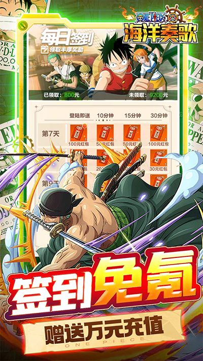 海洋奏歌0.1折版是一款以航海王动漫为背景的轻度挂机卡牌游戏,游戏高度还原的动漫剧情、还有挂机式的卡牌战斗玩法、多样化的副本探索以及激烈的PVP对战在这里玩家需要收集各种卡牌,通过战斗不断提升自己的实力,挑战各种强敌,成为真正的海贼王。每个卡牌都有着不同的属性和技能,玩家需要根据自己的策略和情况来选择合适的卡牌,制定出最佳的战斗计划。并且玩家登录游戏后,既可享受永久0.1折的充值折扣优惠,喜欢航海王题材和策略游戏的玩家,千万不要错过哦,欢迎来本站下载游玩!