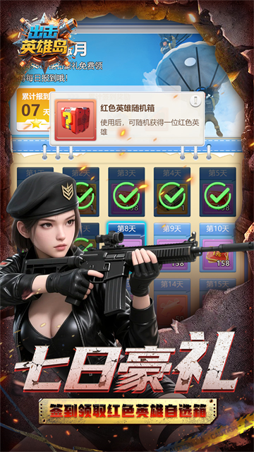 次日送英雄道格拉斯、3 日送英雄吉尔、4日送队列外观·机甲海龟、7日送红色英雄随机宝箱、14 日送“外观·武装战舰”、28 日送红色英雄自选宝箱*3。