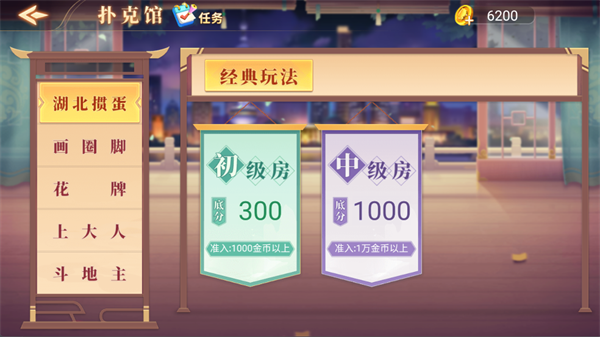 有湖北掼蛋、画圈脚、花牌、上大人、斗地主等多种玩法,经典玩法分初级房和中级房,可根据自身金币数量选择场次参与。