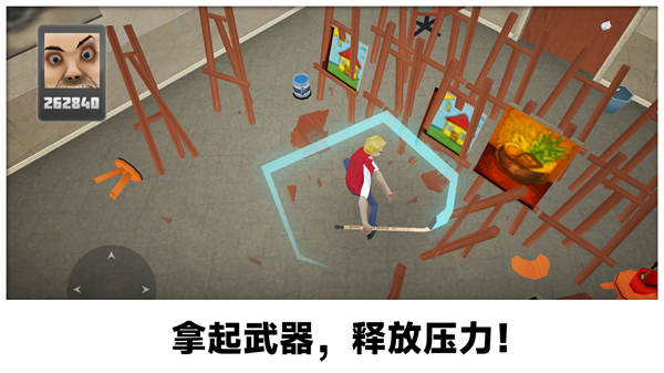 砸烂办公室是一款可以让你疯狂打砸破坏办公室来发泄情绪的解压小游戏。刀枪棍棒电锯大锤,全都一齐上啦!不同武器会有不同的攻速、攻击力属性,破坏这件办公室的一切,什么桌子椅子电脑键盘通通打个稀巴烂吧!游戏玩法操作也非常简单容易,玩家可以操纵角色自由移动,前往不同房间探索破坏,感受解压的瞬间。