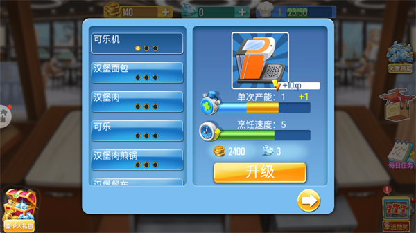消耗金币和钻石升级制作设备,能提升单次产能与烹饪速度,提升美食制作效率。