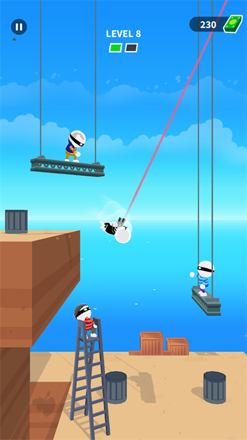 玩家在游戏中操控的是3D小人角色,画风卡通。需要大家做的事情也非常简单,那就是通过跳跃、移动、射击等一系列的操作击杀关卡中的敌人。