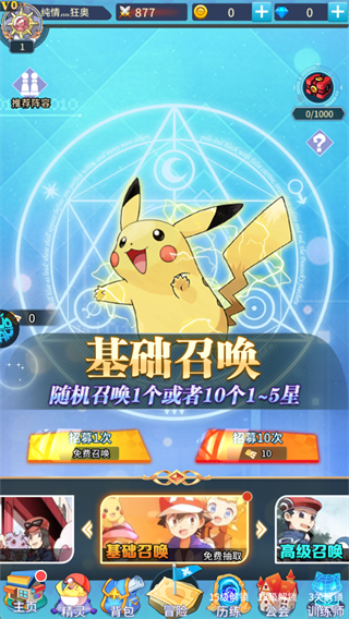 参与【基础召唤】,可进行单次召唤或消耗道具十连召唤,随机获得1~5星精灵。