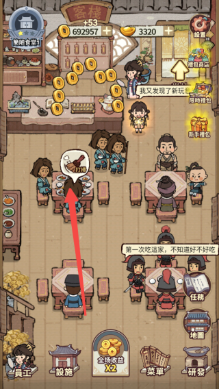 1、进入我在江南开客栈手游,等待客人上桌,点击点菜;