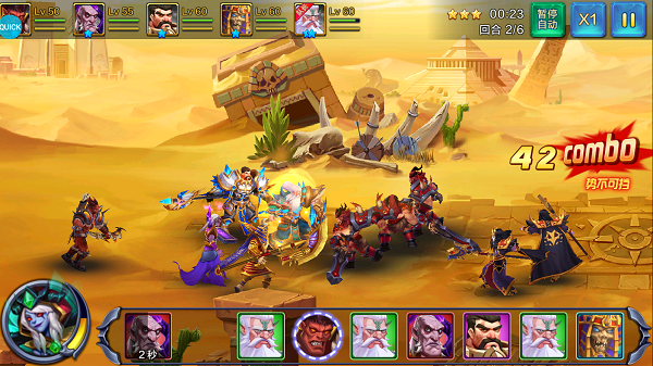 参加战斗的各个武将,每个武将都有两个主动技能以及N个被动技能,在战斗中当下方的技能图标移动到右边时表示cd已好,点一下就可以点掉释放技能了。而通过操作将两三个同一武将的图标聚集在一起,就可以发动更强的技能,这也是本作被称为横版三消的由来。总体来说这个玩法虽然不是原创,但套在三国背景下玩起来也不乏乐趣,带有一定的策略性。