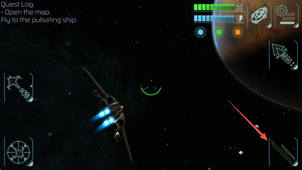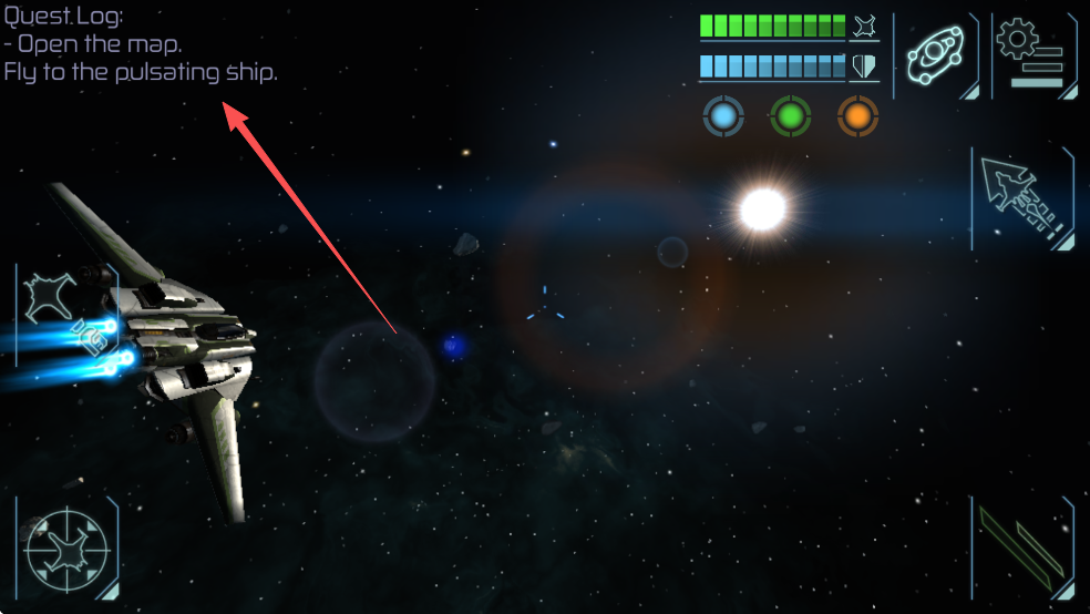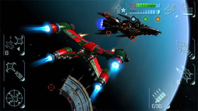 操作方面有两种方式:重力感应或滑屏控制飞船方向。进入游戏后通过左上角的任务打开地图,飞往目标地点作战。红色标记的敌舰需要靠近后加速,锁定并攻击。游戏中可购买的空间站有5座,分布在太阳系和其他随机生成的恒星系统中。