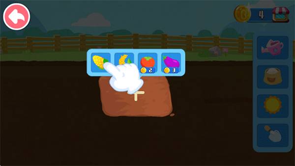 宝宝拿起耙子松松土,将玉米、茄子等蔬菜种子埋进土里。如果想让它们长得又高又壮,别忘了施肥哦。对了,植物生长还需要充足的水分,宝宝快拿出洒水壶,给庄稼地浇浇水。
