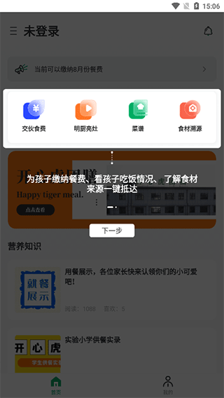 1、首页可以为孩子缴纳餐费,查看孩子吃饭情况,了解食材来源,查看孩子每天的菜谱以及了解各种营养知识