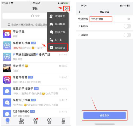 1、点击右上角图标>>点击在线会议>>输入会议名称>>无需设置入会密码,及开启视