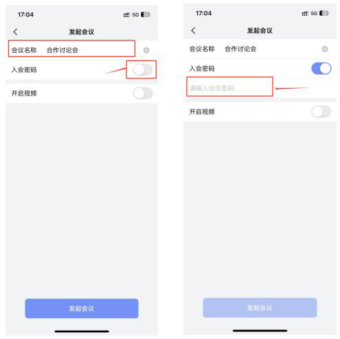 2、需设置入会密码,点击入会密码右侧的图标,将其打开,并输入6位数入会密码>>点击发起会议