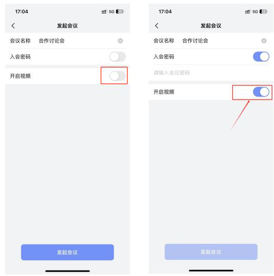 3、需开启视频会议,点击开启视频右侧的图标,将其打开,点击发起会议