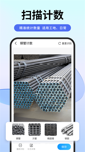 选择计数类型,拍摄或相册导入进行扫描计数,系统智能识别图片中的数量,支持计算钢管、钢筋、盘扣斜杆、轮扣、方管、圆木、方木等。