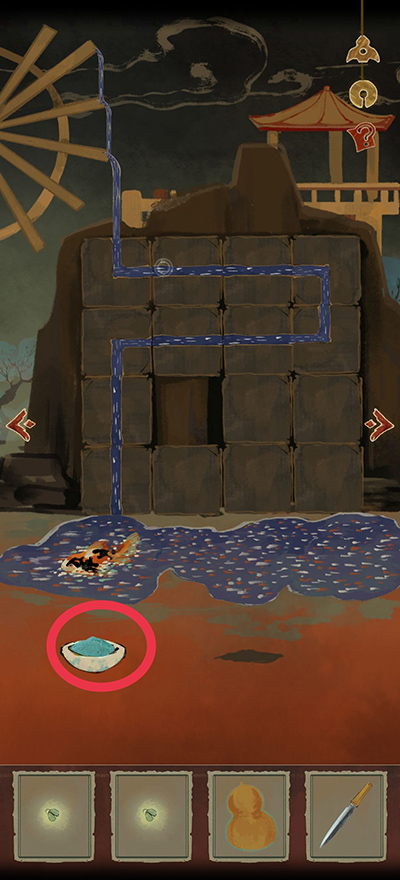 5、然后将种子种在拔出匕首的坑里,拿匕首把葫芦劈开,舀水,浇水,再用玉石催化一下,最后把蝴蝶放在花上传粉(?),就会飞出来一只鸟把鱼带走,最后留下一个盒子。