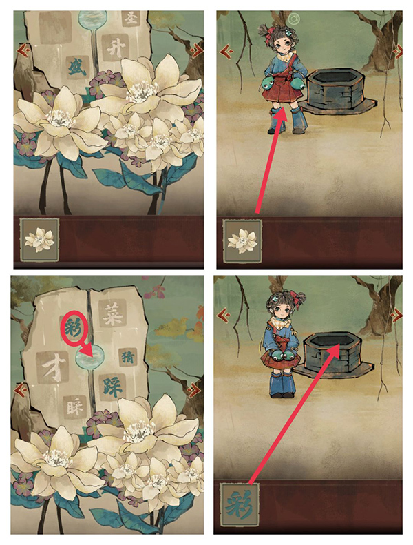 8、接着小女孩就会要求摘一朵花,结果摘完嫌没有颜色,来到字墙,把“彩”拿出来放进井里,女孩结果说要糖画了(细心的应该发现这里两个小女孩长不一样)