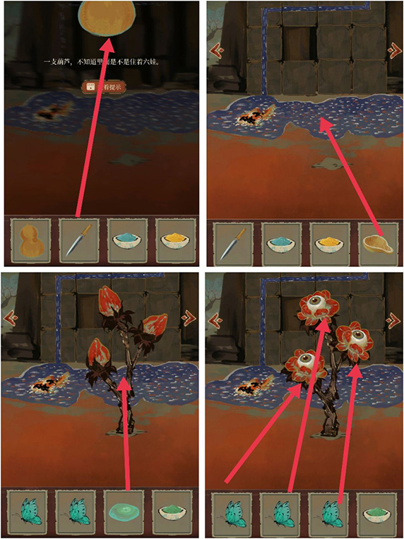 9、然后糖画拿给小女孩,被嫌弃不甜,来到字墙,把“甘”拿出来扔井里,把甜甜的糖画给女孩,结果女孩说要花,打开针灸盒,根据之前缠在柱子上的布条得到四个穴位,扎针,把木心交给女孩,听个故事,要木心开花,去字墙找“感”,扔井里,木心开花得到真心,发现是俩双胞胎女孩。