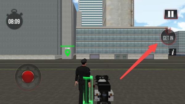 5、进入场景,通过操控杆控制角色移动,靠近警车后的点击“get in”上车;