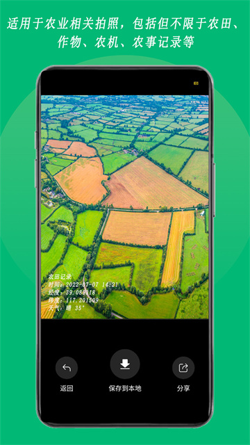 适用于农业相关拍照,包括但不限于农田、作物、农机、农事记录等,适用于农业巡查、勘察取证、外勤拍照、工程管理等;拍照片,防篡改,好用的拍照APP,农业工作者共同的选择。