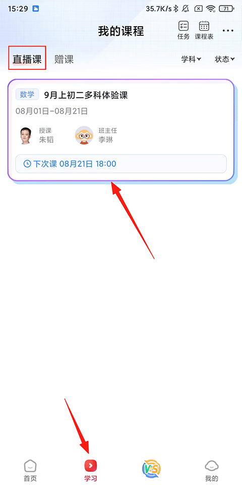 1、在希望学APP学习页点击需要看回放的直播课程;