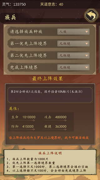 7、在”伐天殿“中,有个族兵功能,这里需要解释一下,每次可上阵单一种族,上限为1000人,族兵个体的四维属性(血、攻、防、速)分别求和构成整体属性,其中只有上阵族兵均为大罗、大罗巅峰境界时,可触发本族族技!