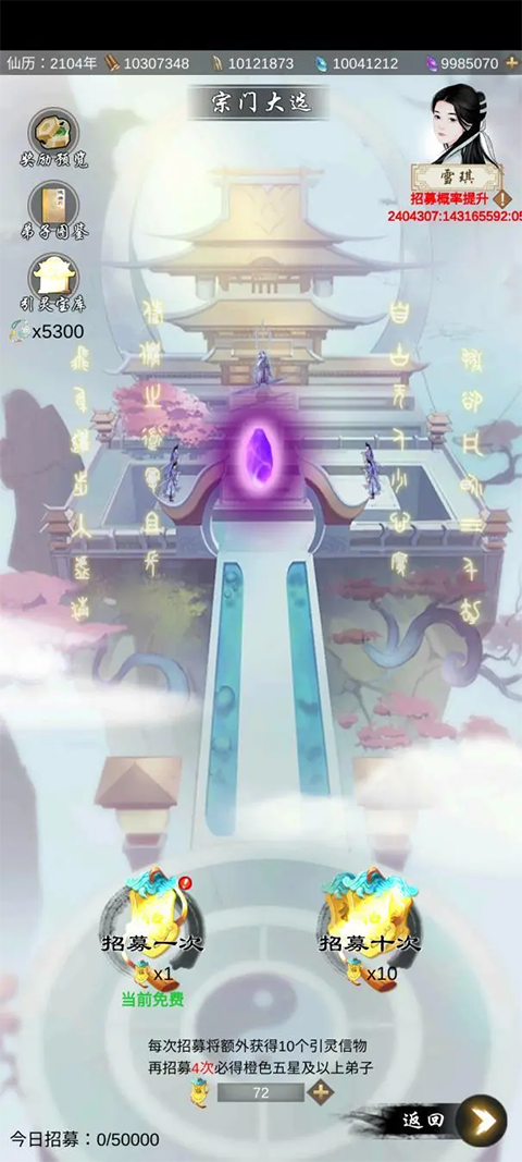 ①宗门大选招收弟子与灵兽诱捕,每日一次免费