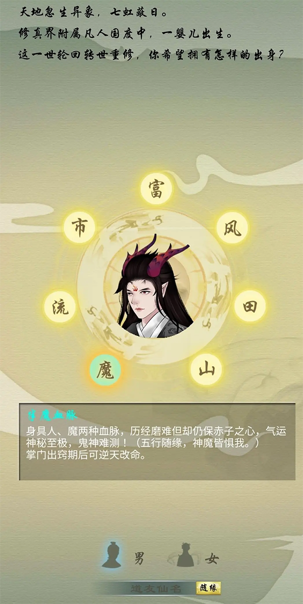 同时需要注意一下,魔宗弃婴的五行是随机分配的。不过到后期会有本命瓷道具,重修灵根与本名天赋,到时候可以再选出身切换属性。