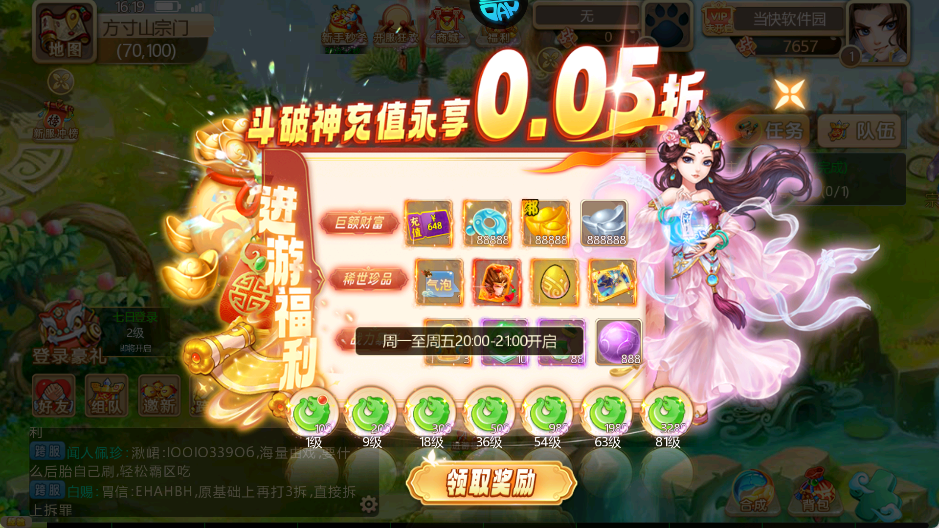 4、创角送财富锦囊:充值卡*648元,仙玉*88888、银元*888888、绑元*88888!