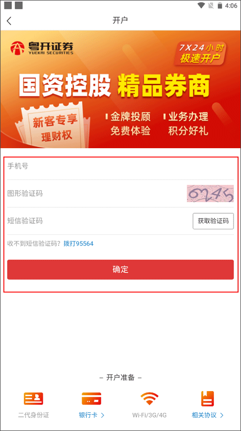 2、首先输入自己的手机号、图形验证码、短信验证码,为开户做准备;
