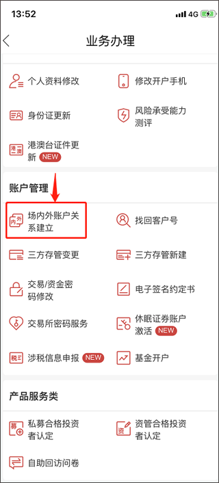 点击粤开证券APP首页【业务办理】或右下角【我的】-【业务办理】,进入业务办理界面,再点击【场内外关系建立】即可办理