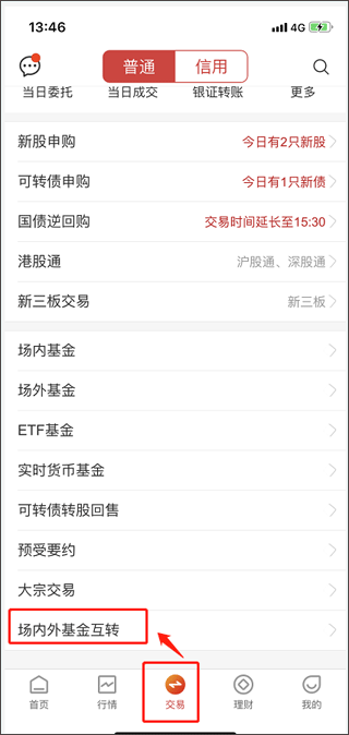第二步:点击交易-【场内外基金互转】-【场外转场内】