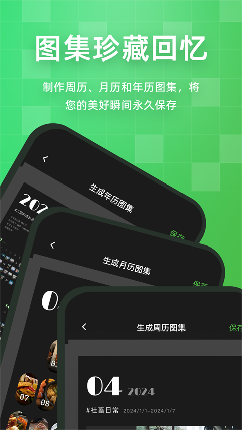 可以生成精美的周历、月历、年历图集,分享生活的美好;