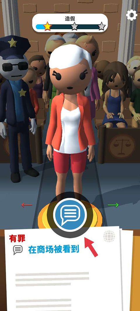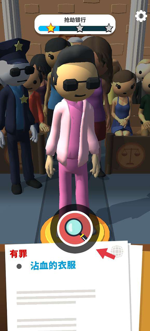 4、点击中间的放大镜就可以扫描嫌疑犯身上是否有血,有血的话就往左边划判定有罪,没有就往右边划无罪。