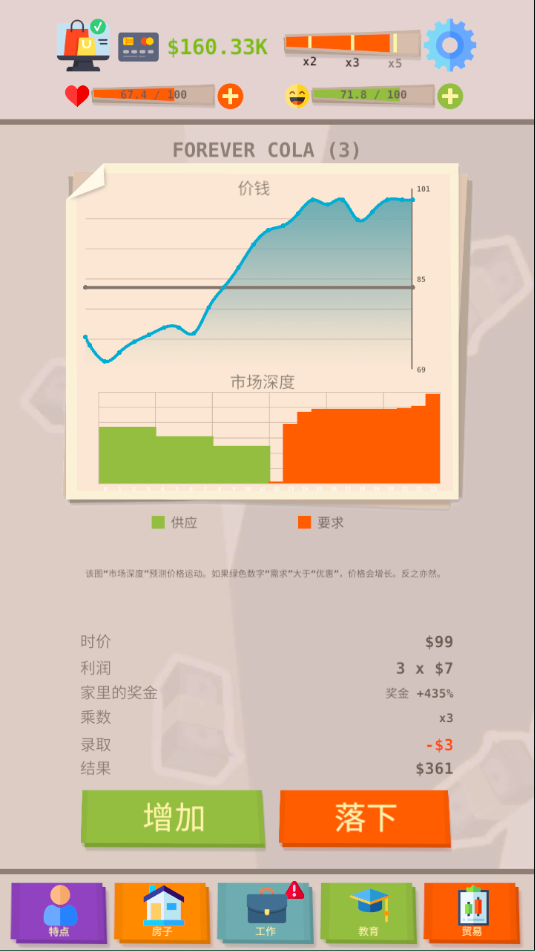 同时在成功人生模拟器游戏中,获得的技能进入成年人的小康生活选择最有趣的工作,提升职业阶梯,买房买车,和女孩出去玩,赚很多钱。最重要的是,通过使用技术指标(价格、趋势、供求量) 分析金融事件和市场情况来学习投资股票,并在证券交易所进行交易。