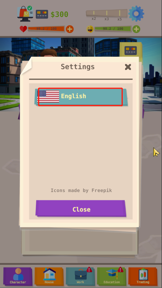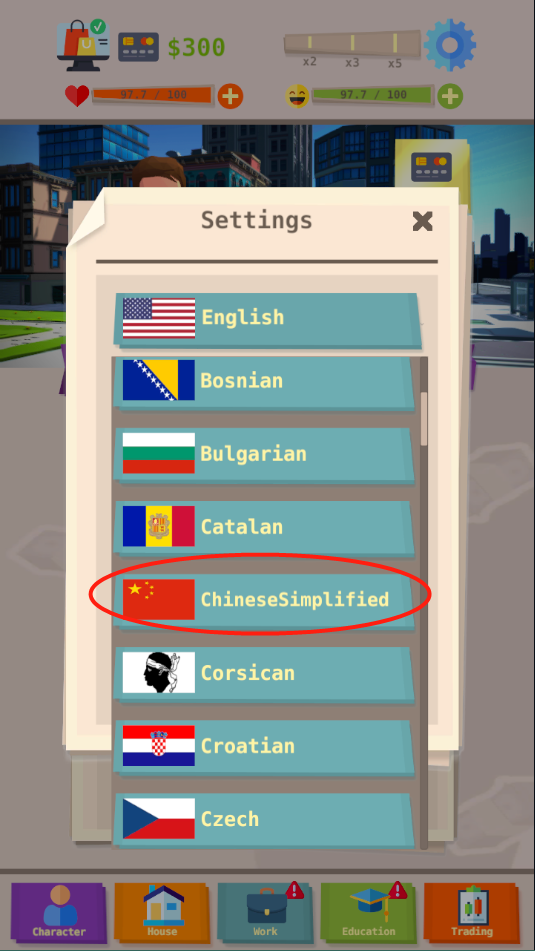 切换中文的方法很简单:进入设置,找到English选项,滑动到“Chinese Simplified”就可以了。新手教程也挺详细,比如先完成家里标记任务,再买个便宜的房子,然后去贸易市场赚点小钱,慢慢积累经验和奖金,解锁更高收入的工作和课程。