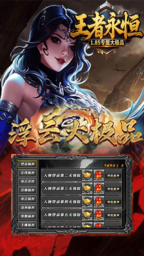 王者永恒是一款好玩刺激的1.85专属大极品的送充传奇手游,采用了领先的3D渲染技术打造,游戏画面精致细腻,完美的演绎了什么叫做传奇,还简化了众多繁杂的按键玩法适配移动端操作的交互设计,让玩家能随时随地感受热血的战斗激情。在王者永恒游戏中玩家上线就送1000元真充红包,每日在线30分钟可以领取1000元真充红包,会员属性免费嫖,材料货币属性免费领,回馈福利,打怪可以免费活动,刀刀切割攻速快。万千福利等你来!