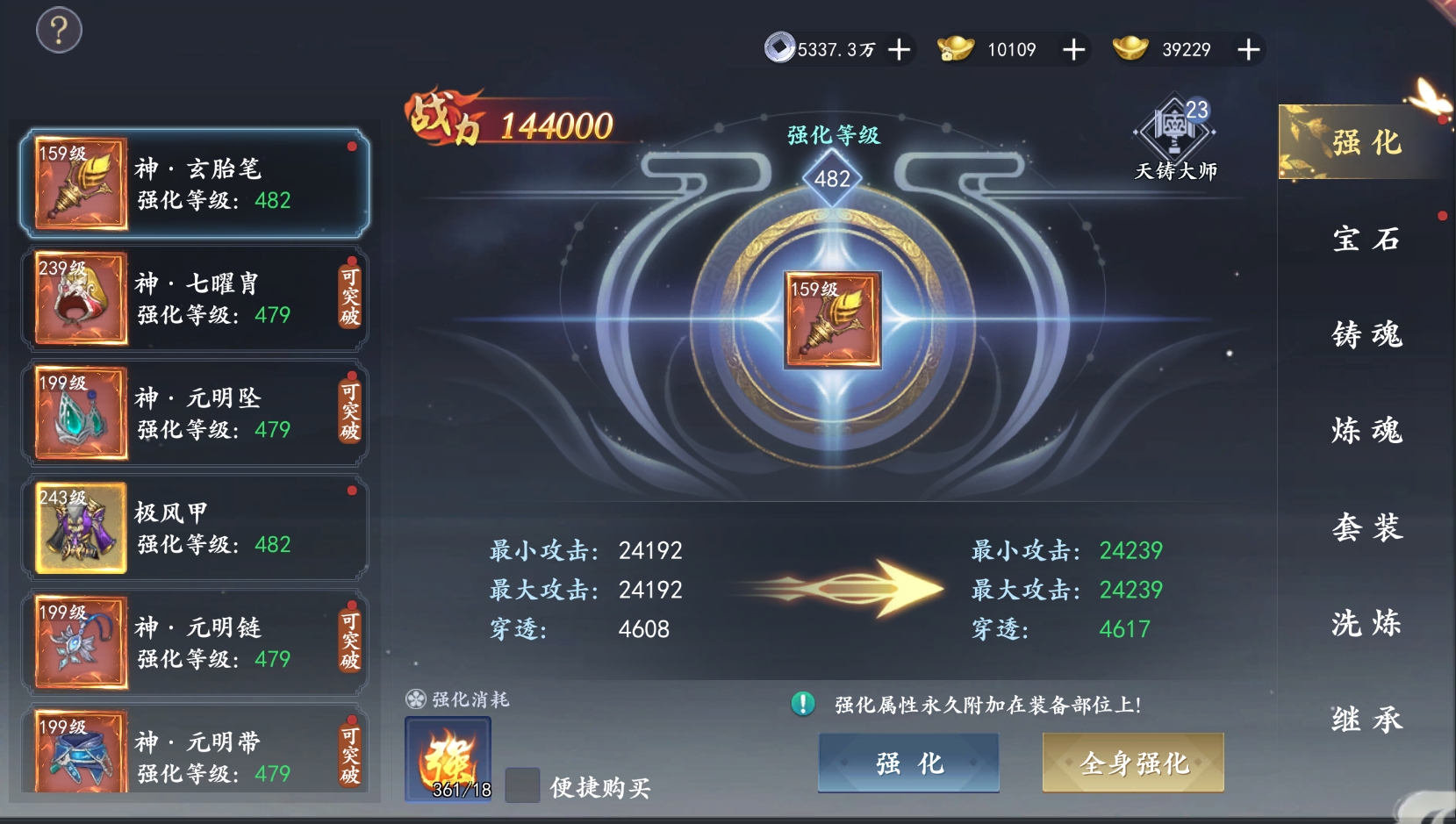 装备强化不仅可以提升属性,还可以解锁装备套装、装备洗练,免费时装外观升级等。消耗强化精华进行强化,每9级可进行一次突破。强化材料可以通过分解装备、商场购买获得。