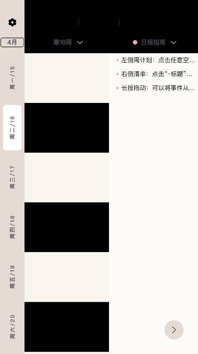 2、日程安排:周计划布局左侧提供周一到周日的安排,右侧清单预览方便查看所有清单页面,使计划更有条不紊。